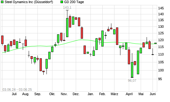 Mit dem Anstieg auf 117,10 EUR hat die Steel Dynamics-Aktie am 02.06.2025 die 200-Tage-Linie nach oben gekreuzt.