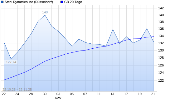 Mit dem Rücksetzer auf 132,18 EUR hat die Steel Dynamics-Aktie am 21.11.2025 die 20-Tage-Linie nach unten gekreuzt.
