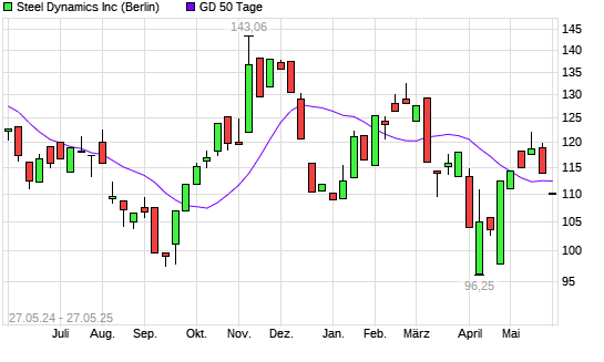 Mit dem Rücksetzer auf 109,20 EUR hat die Steel Dynamics-Aktie am 26.05.2025 die 50-Tage-Linie nach unten gekreuzt.