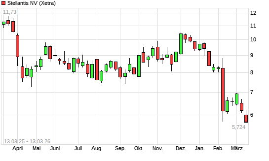 Mit dem Rücksetzer auf 5,94 EUR hat die Stellantis-Aktie (ISIN NL00150001Q9) am 12.03.2026 ein neues 5-Jahres-Tief erreicht und damit den Kurs vom 11.03.2026 eingestellt.