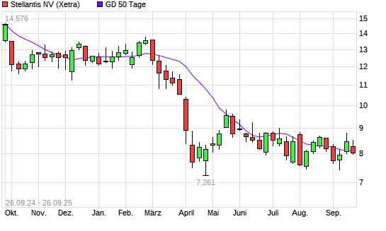 Mit dem Rücksetzer auf 7,99 EUR hat die Stellantis-Aktie am 25.09.2025 die 50-Tage-Linie nach unten gekreuzt.