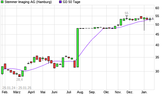 Mit dem Rücksetzer auf 53,20 EUR hat die Stemmer Imaging-Aktie am 24.01.2025 die 50-Tage-Linie nach unten gekreuzt.