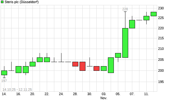 Mit dem Anstieg auf 228,00 EUR hat die Steris-Aktie (ISIN IE00BFY8C754) am 11.11.2025 ein neues 3-Jahres-Hoch erreicht und damit den Kurs vom 07.11.2025 eingestellt.