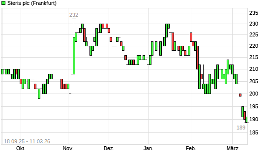 Mit dem Rücksetzer auf 190,00 EUR hat die Steris-Aktie (ISIN IE00BFY8C754) am 10.03.2026 ein neues 6-Monats-Tief erreicht und damit den Kurs vom 09.03.2026 eingestellt.