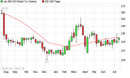 Mit dem Rücksetzer auf 124,00 EUR hat die Sto Vz-Aktie am 18.07.2025 die 100-Tage-Linie nach unten gekreuzt.
