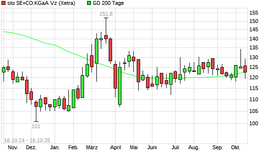 Mit dem Rücksetzer auf 122,20 EUR hat die Sto Vz-Aktie am 15.10.2025 die 200-Tage-Linie nach unten gekreuzt.