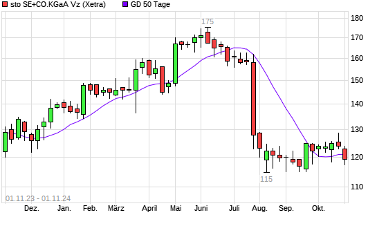 Mit dem Rücksetzer auf 118,20 EUR hat die Sto Vz-Aktie am 31.10.2024 die 50-Tage-Linie nach unten gekreuzt.