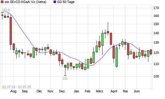 Mit dem Rücksetzer auf 120,60 EUR hat die Sto Vz-Aktie am 30.06.2025 die 50-Tage-Linie nach unten gekreuzt.