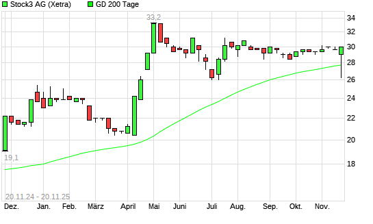 Mit dem Rücksetzer auf 25,20 EUR hat die Stock3 AG (ex BörseGo)-Aktie am 19.11.2025 die 200-Tage-Linie nach unten gekreuzt.Die Stock3 AG (ex BörseGo)-Aktie befand sich seit dem 18.10.2024 ...weiterlesen