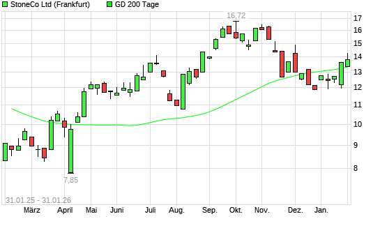 Mit dem Anstieg auf 13,81 EUR hat die Stoneco-Aktie am 30.01.2026 die 200-Tage-Linie nach oben gekreuzt.