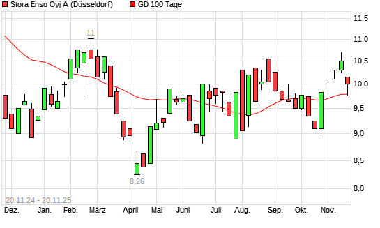 Mit dem Anstieg auf 9,96 EUR hat die Stora Enso-Aktie am 19.11.2025 die 100-Tage-Linie nach oben gekreuzt.