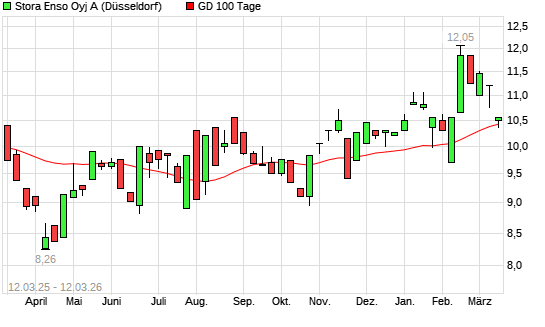 Mit dem Anstieg auf 10,55 EUR hat die Stora Enso-Aktie am 11.03.2026 die 100-Tage-Linie nach oben gekreuzt.