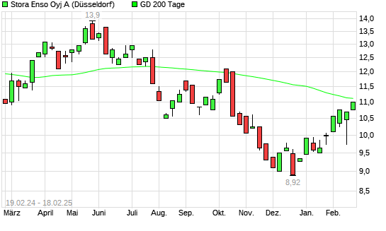 Mit dem Anstieg auf 11,15 EUR hat die Stora Enso-Aktie am 17.02.2025 die 200-Tage-Linie nach oben gekreuzt.