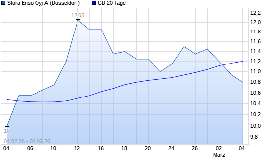 Mit dem Rücksetzer auf 10,95 EUR hat die Stora Enso-Aktie am 03.03.2026 die 20-Tage-Linie nach unten gekreuzt.