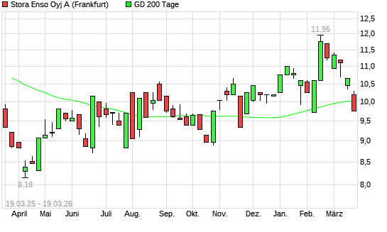 Mit dem Rücksetzer auf 10,00 EUR hat die Stora Enso-Aktie am 18.03.2026 die 200-Tage-Linie nach unten gekreuzt.