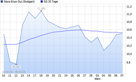 Mit dem Rücksetzer auf 10,43 EUR hat die Stora Enso R-Aktie am 07.03.2025 die 20-Tage-Linie nach unten gekreuzt.