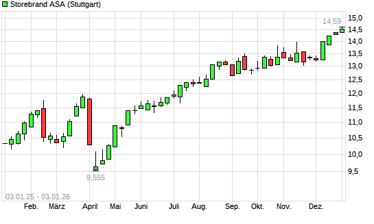 Mit dem Anstieg auf 14,54 EUR hat die Storebrand-Aktie (ISIN NO0003053605) am 02.01.2026 ein neues All-Time-High erreicht und damit den Kurs vom 01.01.2026 eingestellt.