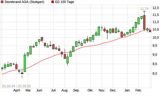 Mit dem Rücksetzer auf 10,49 EUR hat die Storebrand-Aktie am 28.02.2025 die 100-Tage-Linie nach unten gekreuzt.