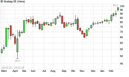 Mit dem Anstieg auf 96,90 EUR hat die Strabag SE-Aktie (ISIN AT000000STR1) am 17.02.2026 ein neues All-Time-High erreicht und damit den Kurs vom 16.02.2026 eingestellt.
