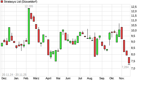 Mit dem Rücksetzer auf 7,28 EUR hat die Stratasys-Aktie (ISIN IL0011267213) am 19.11.2025 ein neues 12-Monats-Tief erreicht und damit den Kurs vom 18.11.2025 eingestellt.