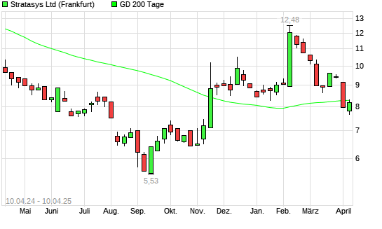 Mit dem Rücksetzer auf 7,66 EUR hat die Stratasys-Aktie am 09.04.2025 die 200-Tage-Linie nach unten gekreuzt.