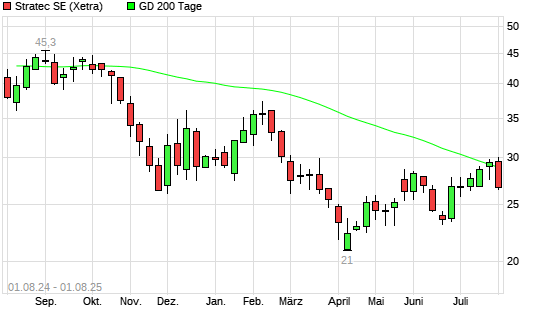 Mit dem Rücksetzer auf 28,10 EUR hat die Stratec-Aktie am 31.07.2025 die 200-Tage-Linie nach unten gekreuzt.
