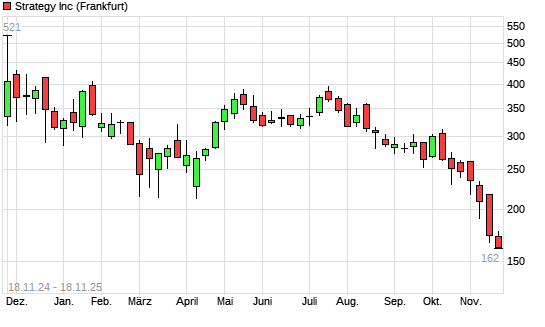 Mit dem Rücksetzer auf 168,00 EUR hat die Strategy-Aktie (ISIN US5949724083) am 17.11.2025 ein neues 12-Monats-Tief erreicht und damit den Kurs vom 14.11.2025 eingestellt.