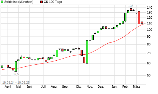 Mit dem Anstieg auf 111,00 EUR hat die Stride-Aktie am 18.03.2025 die 100-Tage-Linie nach oben gekreuzt.