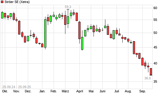 Mit dem Rücksetzer auf 37,85 EUR hat die Ströer-Aktie (ISIN DE0007493991) am 24.09.2025 ein neues 12-Monats-Tief erreicht und damit den Kurs vom 23.09.2025 eingestellt.