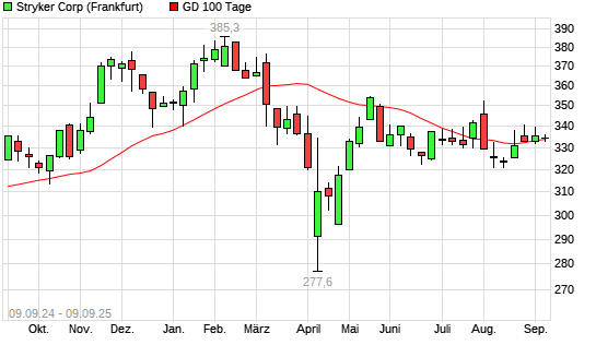 Mit dem Rücksetzer auf 333,70 EUR hat die Stryker-Aktie am 08.09.2025 die 100-Tage-Linie nach unten gekreuzt.