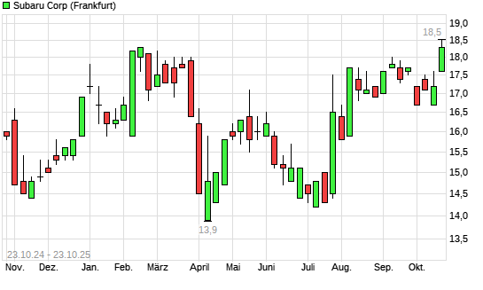 Mit dem Anstieg auf 18,50 EUR hat die Subaru-Aktie (ISIN JP3814800003) am 22.10.2025 ein neues 12-Monats-Hoch erreicht und damit den Kurs vom 14.02.2025 eingestellt.