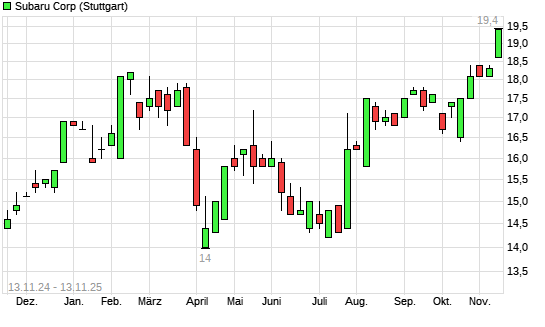 Mit dem Anstieg auf 19,80 EUR hat die Subaru-Aktie (ISIN JP3814800003) am 12.11.2025 ein neues 12-Monats-Hoch erreicht und damit den Kurs vom 11.11.2025 eingestellt.