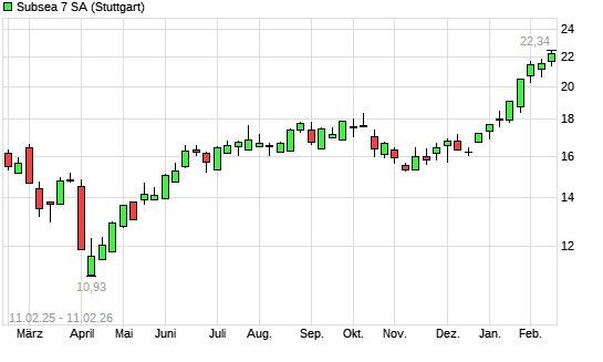 Mit dem Anstieg auf 22,00 EUR hat die Subsea 7-Aktie (ISIN LU0075646355) am 10.02.2026 ein neues All-Time-High erreicht und damit den Kurs vom 02.02.2026 eingestellt.