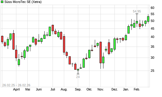 Mit dem Anstieg auf 52,85 EUR hat die Suess MicroTec-Aktie (ISIN DE000A1K0235) am 25.02.2026 ein neues 12-Monats-Hoch erreicht und damit den Kurs vom 24.02.2026 eingestellt.
