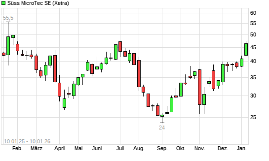 Mit dem Anstieg auf 46,66 EUR hat die Suess MicroTec-Aktie (ISIN DE000A1K0235) am 09.01.2026 ein neues 6-Monats-Hoch erreicht und damit den Kurs vom 07.01.2026 eingestellt.