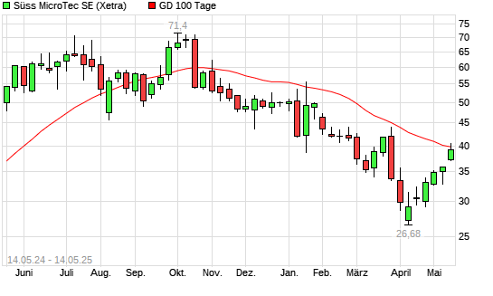 Mit dem Anstieg auf 39,72 EUR hat die Suess MicroTec-Aktie am 13.05.2025 die 100-Tage-Linie nach oben gekreuzt.