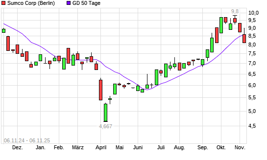 Mit dem Rücksetzer auf 7,98 EUR hat die Sumco-Aktie am 05.11.2025 die 50-Tage-Linie nach unten gekreuzt.