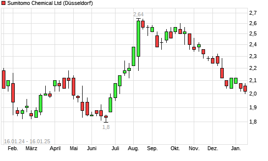 Mit dem Rücksetzer auf 1,93 EUR hat die Sumitomo Chemical-Aktie (ISIN JP3401400001) am 15.01.2025 ein neues 6-Monats-Tief erreicht und damit den Kurs vom 14.01.2025 eingestellt.