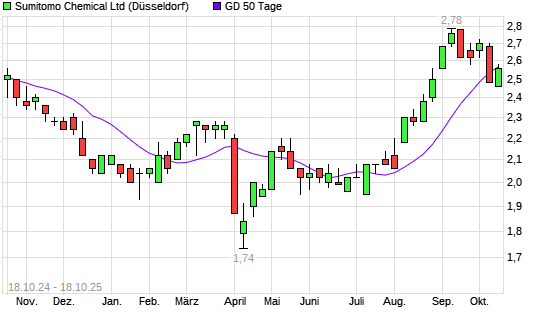 Mit dem Rücksetzer auf 2,58 EUR hat die Sumitomo Chemical-Aktie am 17.10.2025 die 50-Tage-Linie nach unten gekreuzt.