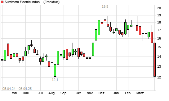 Mit dem Rücksetzer auf 12,10 EUR hat die Sumitomo Electric Industries-Aktie (ISIN JP3407400005) am 04.04.2025 ein neues 6-Monats-Tief erreicht und damit den Kurs vom 03.04.2025 eingestellt.