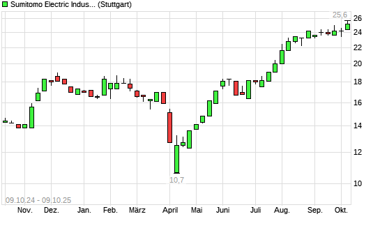 Mit dem Anstieg auf 25,40 EUR hat die Sumitomo Electric Industries-Aktie (ISIN JP3407400005) am 08.10.2025 ein neues All-Time-High erreicht und damit den Kurs vom 07.10.2025 eingestellt.