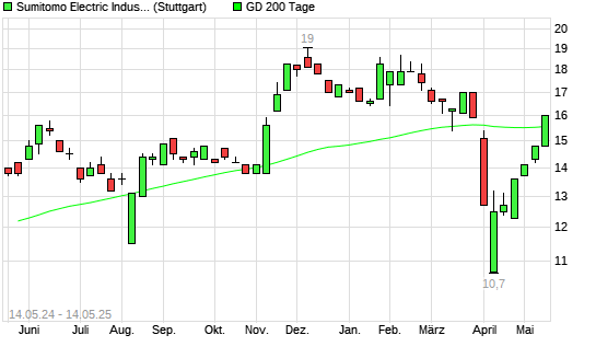 Mit dem Anstieg auf 15,80 EUR hat die Sumitomo Electric Industries-Aktie am 13.05.2025 die 200-Tage-Linie nach oben gekreuzt.