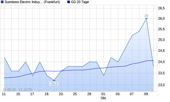 Mit dem Rücksetzer auf 23,80 EUR hat die Sumitomo Electric Industries-Aktie am 10.10.2025 die 20-Tage-Linie nach unten gekreuzt.