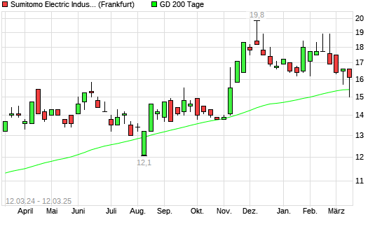 Mit dem Rücksetzer auf 15,00 EUR hat die Sumitomo Electric Industries-Aktie am 11.03.2025 die 200-Tage-Linie nach unten gekreuzt.