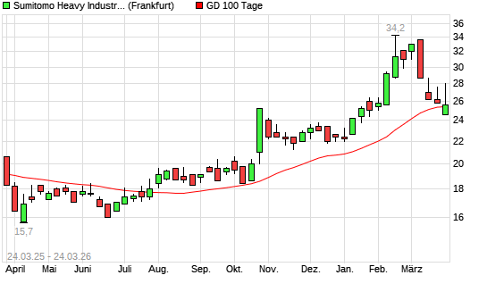 Mit dem Rücksetzer auf 25,20 EUR hat die Sumitomo Heavy Industries-Aktie am 23.03.2026 die 100-Tage-Linie nach unten gekreuzt.