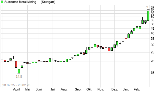 Mit dem Anstieg auf 67,50 EUR hat die Sumitomo Metal Mining-Aktie (ISIN JP3402600005) am 27.02.2026 ein neues All-Time-High erreicht und damit den Kurs vom 25.02.2026 eingestellt.