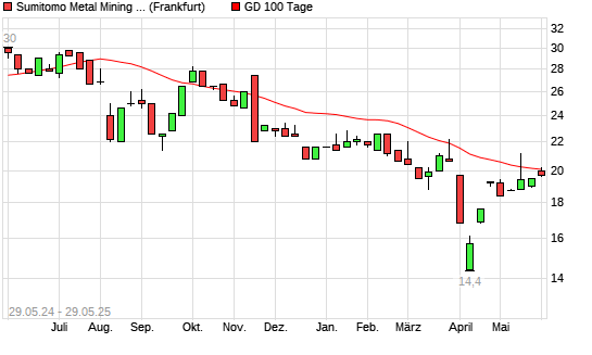 Mit dem Rücksetzer auf 19,60 EUR hat die Sumitomo Metal Mining-Aktie am 28.05.2025 die 100-Tage-Linie nach unten gekreuzt.