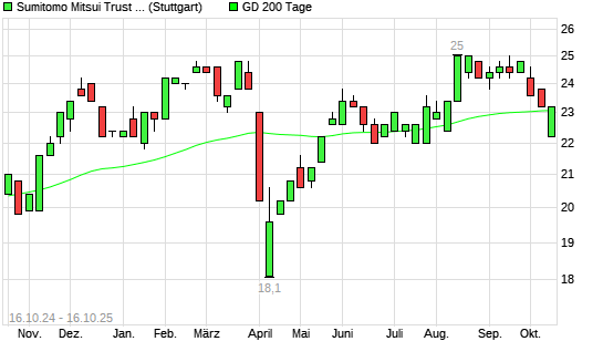 Mit dem Anstieg auf 23,20 EUR hat die Sumitomo Mitsui Trust Holdings-Aktie am 15.10.2025 die 200-Tage-Linie nach oben gekreuzt.