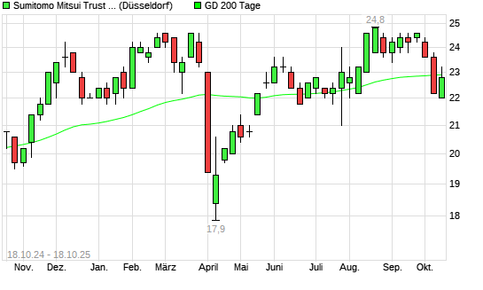 Mit dem Rücksetzer auf 22,80 EUR hat die Sumitomo Mitsui Trust Holdings-Aktie am 17.10.2025 die 200-Tage-Linie nach unten gekreuzt.