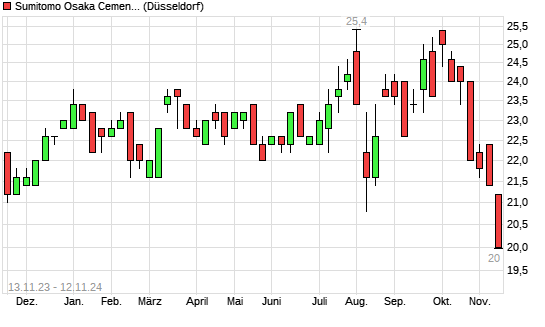 Mit dem Rücksetzer auf 21,00 EUR hat die Sumitomo Osaka Cement-Aktie (ISIN JP3400900001) am 11.11.2024 ein neues 12-Monats-Tief erreicht und damit den Kurs vom 16.11.2023 eingestellt.